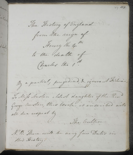 Primele scrieri ale lui Jane Austen sunt imitații comice sau parodii ale unor romane populare: ale clasicului Sir Charles Grandison al autorului ei favorit Samuel Richardson; a manualului de școală al lui Oliver Goldsmith, The History of England (4 vol., 1771); a eseiştilor Joseph Addison şi Samuel Johnson; și a antologiilor de piese morale și „Extracte elegante” care au format elementul de bază al educației tinerelor domnișoare „Istoria Angliei... De către un istoric parțial, cu prejudecăți și ignorant” din volumul al doilea este o colaborare cu sora ei Cassandra . care a furnizat 13 portrete caricaturale colorate. Istoria falsării este modelată în mod conștient pe istoria lui Goldsmith, cu speranța sa prefabricată că „cititorul îmi va recunoaște imparțialitatea” Goldsmith include și portrete medalioane ale regilor.